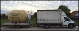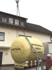 Nach dem Abladen wird der Speicher aufgerichtet und in die Baugrube versenkt. |